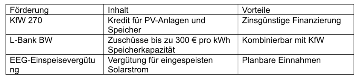 Über KfW und L-Bank erhalten Sie zinsgünstige Kredite und Zuschüsse für PV-Anlagen und Stromspeicher. Auch kommunale Programme lassen sich ergänzend nutzen. Wir informieren uns gerne mit Ihnen zu den regionalen Zuschüssen und Förderungen, um das Beste für Sie herauszuholen.